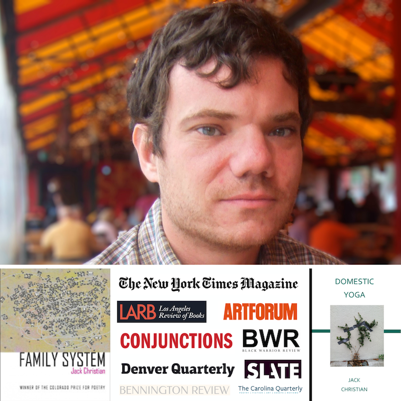 Taught by Jack Christian, author of the poetry collections Family System, winner of the Colorado Poetry Prize, published by Colorado State University's Center for Literary Publishing, and Domestic Yoga, published by Groundhog Poetry Press. His work has appeared in periodicals including Bennington Review, Black Warrior Review, Conjunctions, Denver Quarterly, jubilat, The New York Times Magazine, Los Angeles Review of Books, ArtForum, Atticus Review, Cleveland Review of Books, The Diagram, The Journal, and Slate. Jack holds an MFA in poetry from University of Massachusetts Amherst.